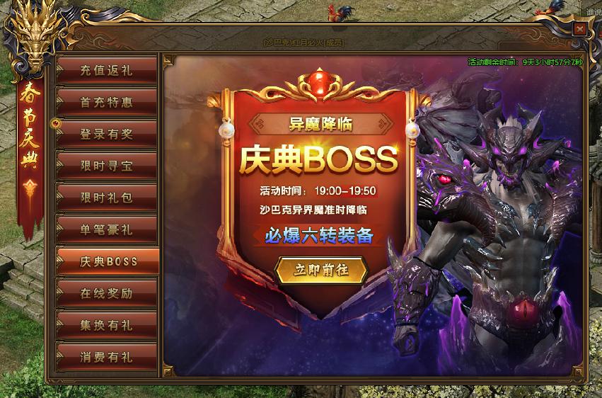 活动规则:庆典期间每天晚上19:00-19:50沙巴克异魔准时降临,必爆六转装备哦!也有概率获得八转装备哦!