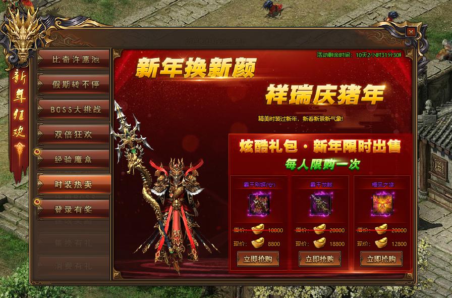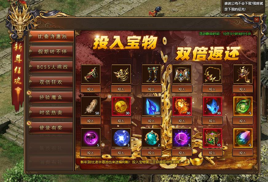 活动规则:活动期间,在比奇许愿池投入宝物,第二天可获得双倍惊喜。