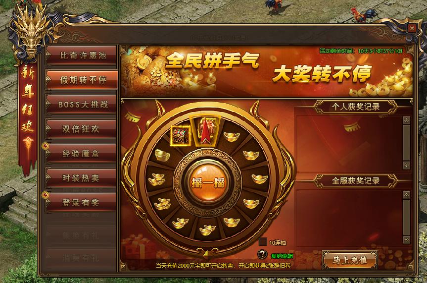 活动规则:活动期间,每日充值2000元宝即可开启转盘,每日零点充值,新年好运气,从这里开始啦!