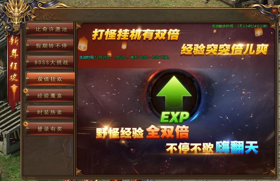 活动规则:活动期间,打怪挂机有双倍,经验突突倍儿爽!