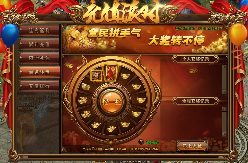 活动规则:当天充值2000元宝即可开启转盘,开启即获2张红月券