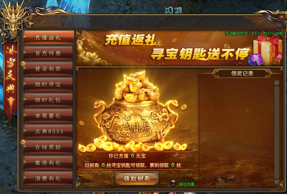 活动规则:活动期间,每累计充值2000元宝即可获得一枚寻宝钥匙,上不封顶;机会不多不要错过了哦!