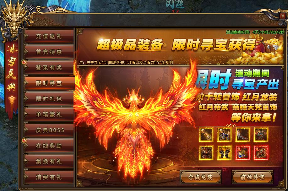 活动规则:活动期间,限时寻宝新增产狮舞秀金春(女),梵轮辟邪金禅、百鸟朝凤、遁甲 黯焰翼骸、九命裘衣(女)、惊魂灵狐剑、阎罗御神、双子守护、氪石歼灭者(女)、至高超人战甲(女)、红月龙袍-无相神皇御(女)、圣羽之辉、双鱼守护、天之哀伤、霜镰天刑、天刑雪衣(女)、水瓶守护、淡蓝素雅(女),蓝羽白玫权杖。高阶十转首饰、红月龙装、红月帝武、帝释天梵首饰,有没有心动,想不想要,快点寻宝抽起来!