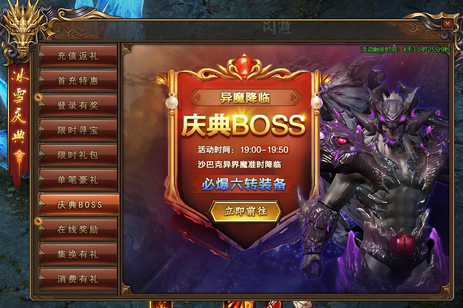 活动规则:庆典期间每天晚上19:00-19:50沙巴克异魔准时降临,必爆六转装备哦!也有概率获得八转装备哦!