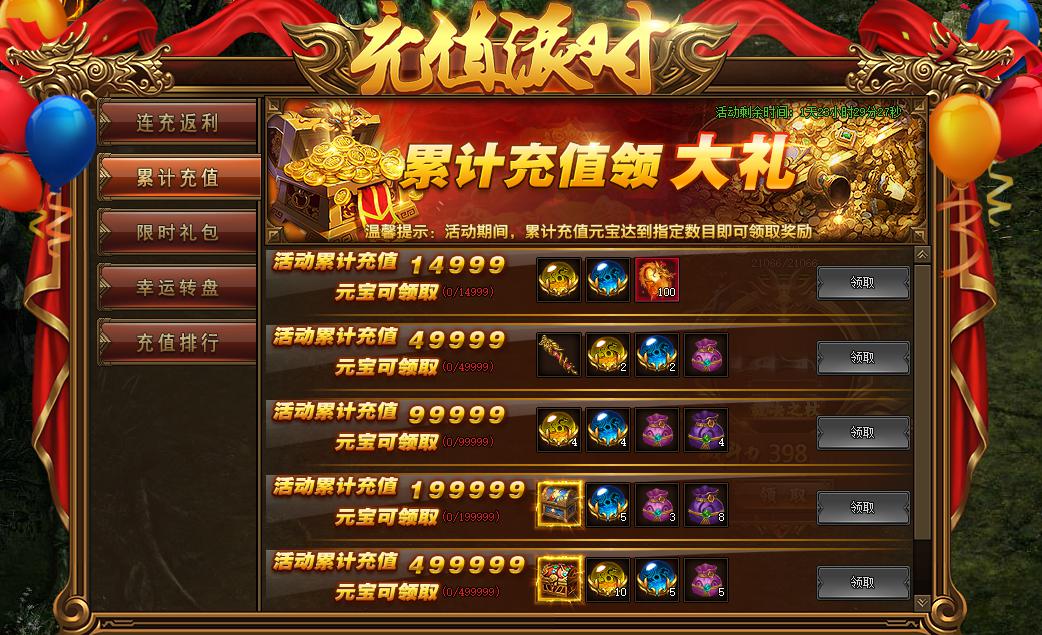 活动规则:活动期间,累计充值达到指定数目即可领取丰厚大礼