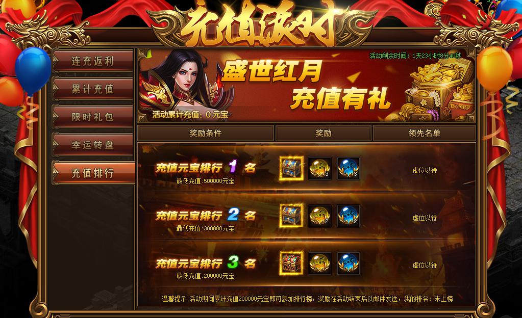 活动规则:活动期间,累计充值元宝达指定数目即可参加排行榜,奖励多多,行动起来吧!