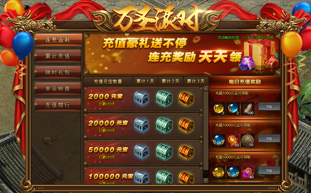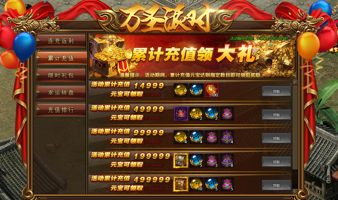活动规则:活动期间,累计充值元宝达到指定数目即可领取奖励