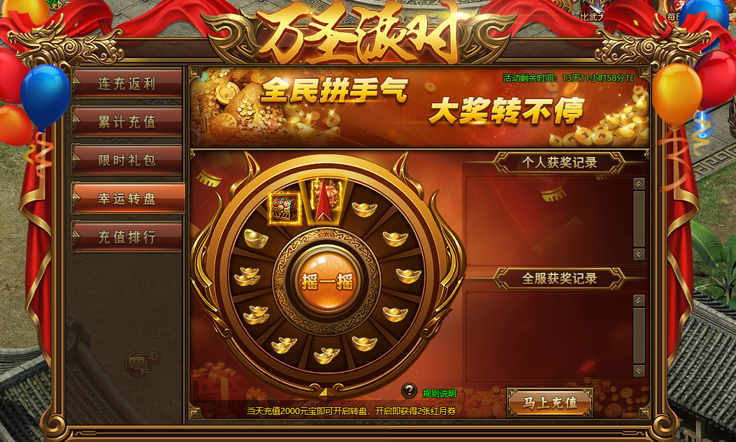 活动规则:当天充值2000元宝即可开启转盘,开启即获2张红月券