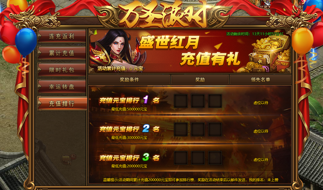 活动规则:活动期间累计充值20万元宝即可参与排行榜,超值奖励等你哦