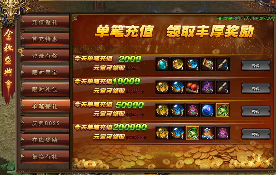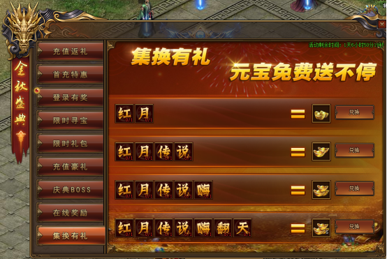 活动规则:活动期间,每充值1000元宝即可领取超值大礼包一份!