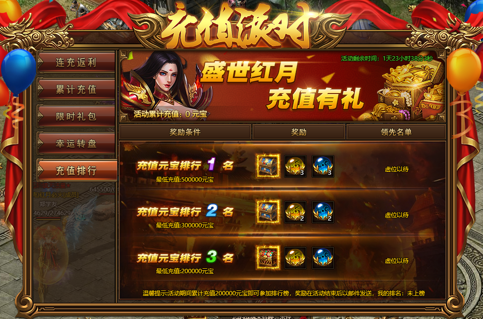 活动规则:活动期间累计充值20万元宝即可参与排行榜,超值奖励等你哦
