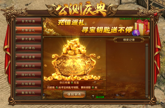 活动内容:活动期间,每日充值2000元宝即可领取一把寻宝钥匙,多冲多送