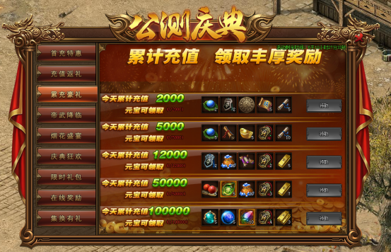 活动内容:活动期间,每日累计充值满足要求即可领取对应的奖励