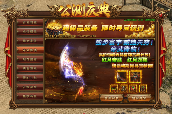 活动内容:独步寰宇,威绝天穹,帝武降临!活动期间,寻宝将产出红月帝武,红月龙袍,帝梵天首饰等等,机会难得,切勿错过!