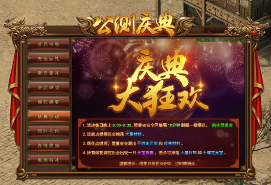 活动内容:活动每日晚上8:00-8:30盟重省安全区每隔10分钟刷新一批烟花,点燃烟花会掉大量材料,烟花点燃后,会刷出不绑定元宝和珍贵材料。所有烟花刷完后会出现一只元宝瑞兽,击杀可掉落大量材料和不绑定元宝