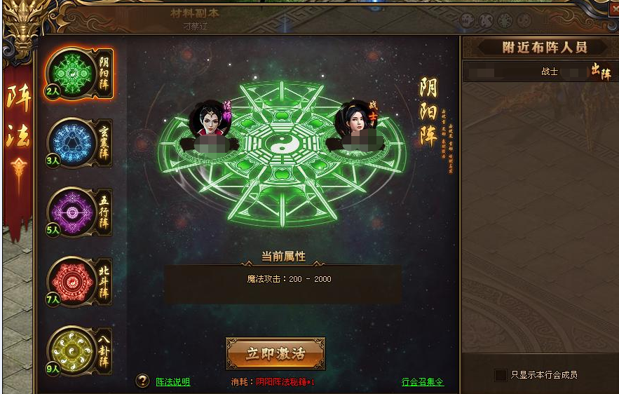 阵法秘籍从藏经阁活动、商城产生,站立在布阵者周围可参与布阵,所有阵员必须在同一地图内才可激活阵法属性