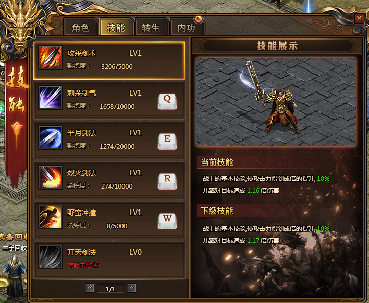 攻杀剑术:战士的基本技能,使攻击力得到成倍的提升,10%几率对目标造成1.16倍伤害