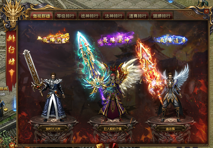 创千秋霸业,博万古英名!屠蛮荒妖魔,续传奇热血!乱世出英雄,谁是英雄?《玛法归来》只会用数据说话。排行榜,是整个传奇大陆最全面、最权威、最与时俱进的英雄排行榜!这里不仅有狂傲战士的矫健身影,也有冷艳法师的飘逸绝尘和全能道士的惊艳出场。三职业交相辉映,创霸业共谱奇迹!