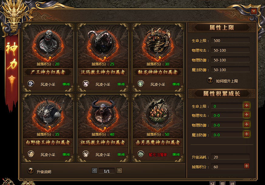 通过击杀boss,掉落积分,获得相应的积分,从而能增加属性的成长值,生命上限、物理攻击、物理防御、魔法防御等。