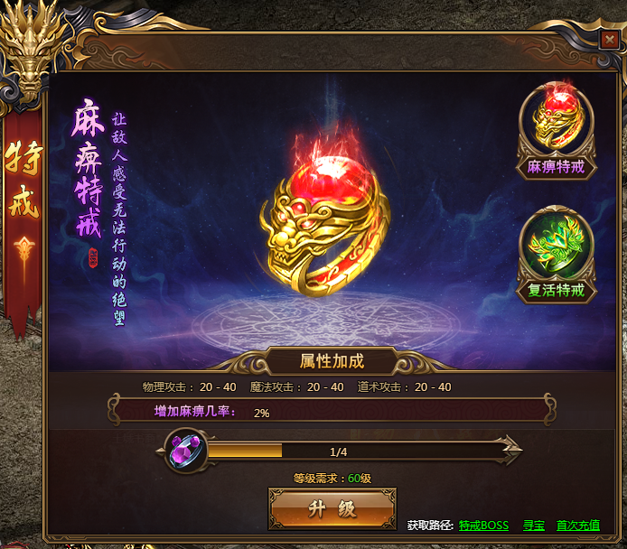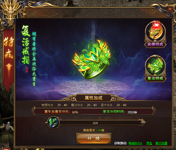 复活戒指:拥有着将会再次浴火重生功能。可以通过特戒boss,寻宝,首充等获取