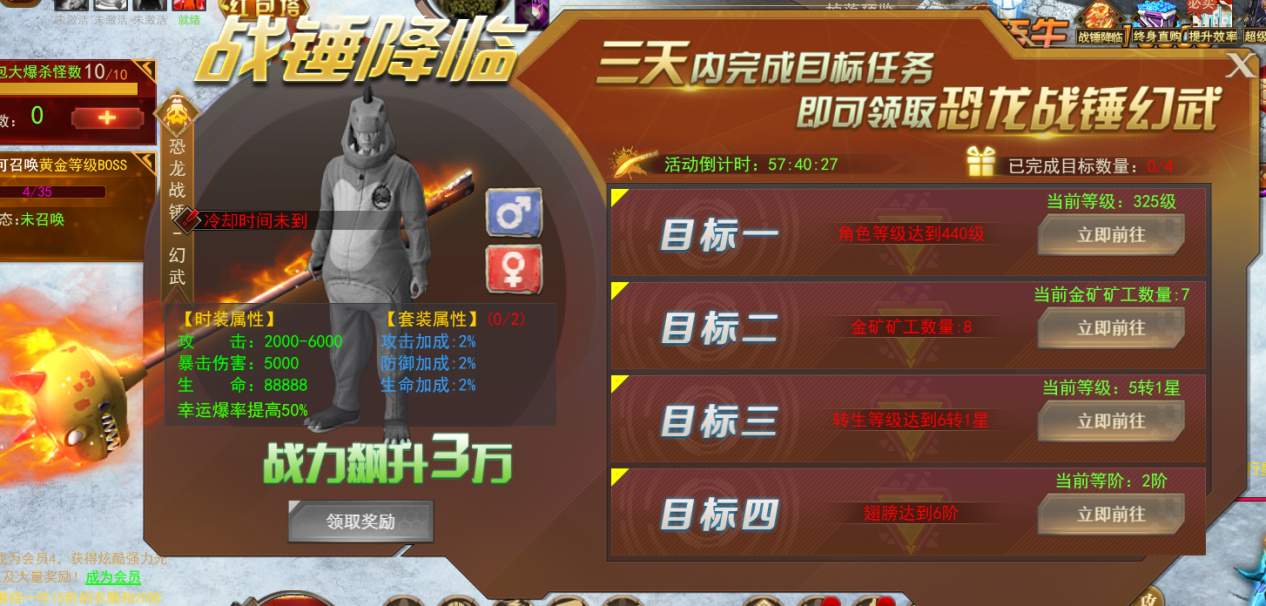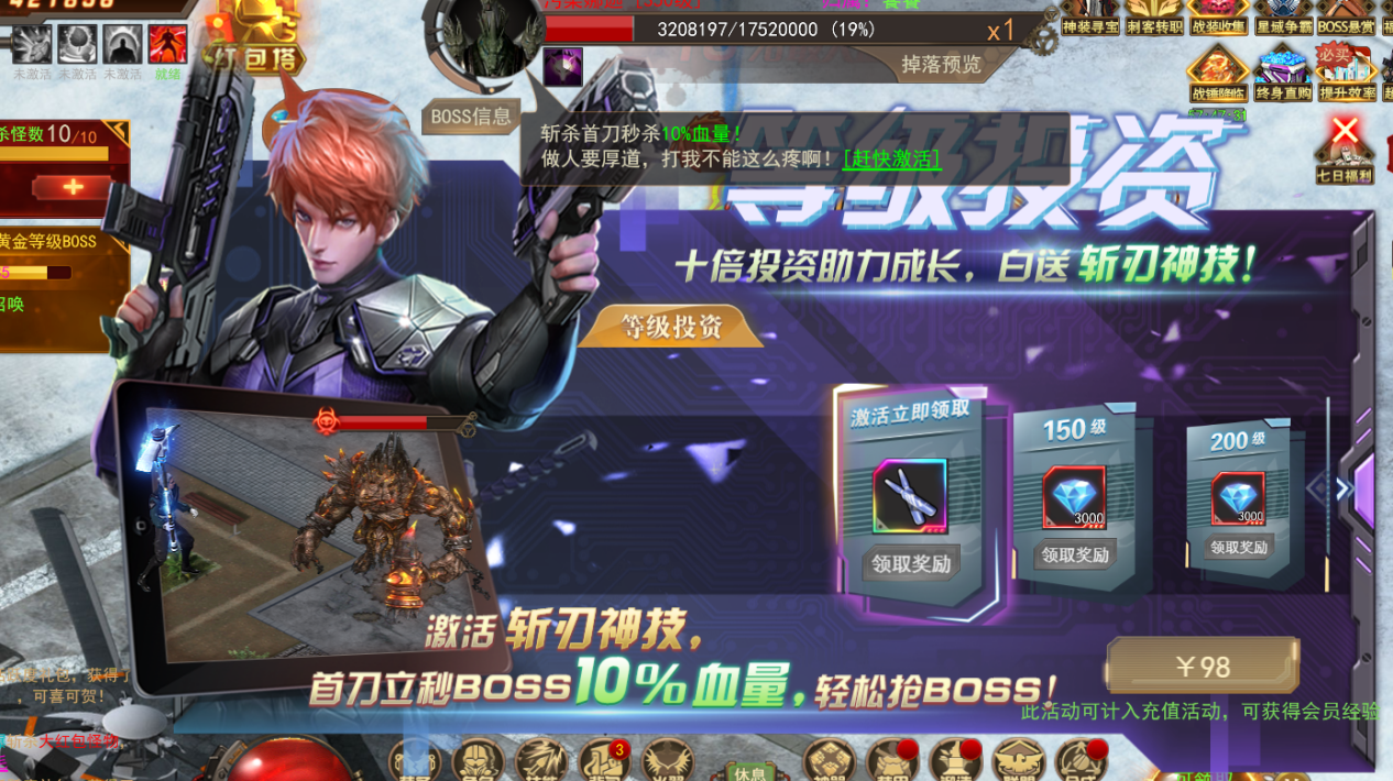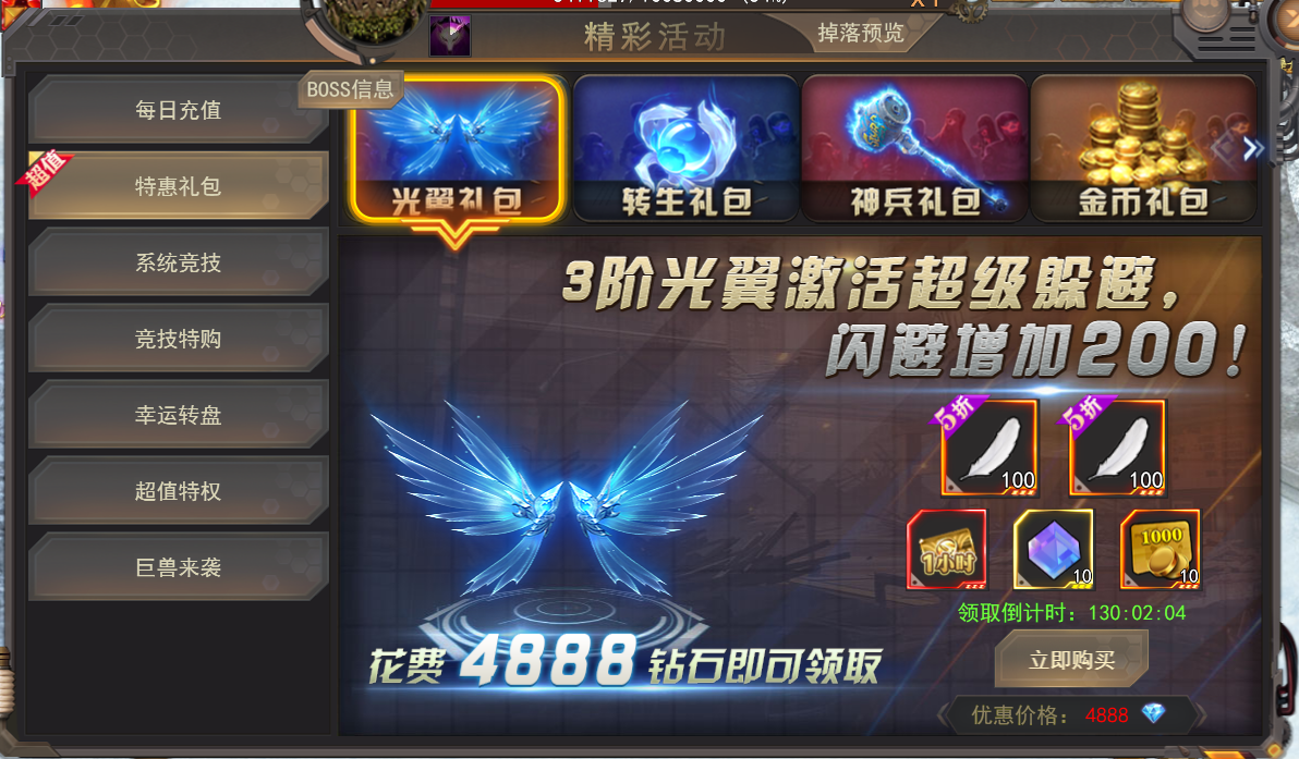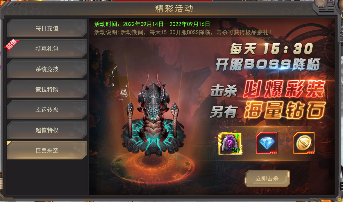 活动说明:活动期间,定点击杀活动BOSS,获得稀有装备!