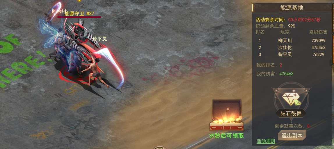 能源基地每日18点开启,活动根据伤害排名发放巨量金币奖励,对守护者伤害排名越高的玩家可获得越多的奖励;活动期间可消耗钻石进行鼓舞,每次鼓舞都可增加自身10%的属性,最多可鼓舞10次