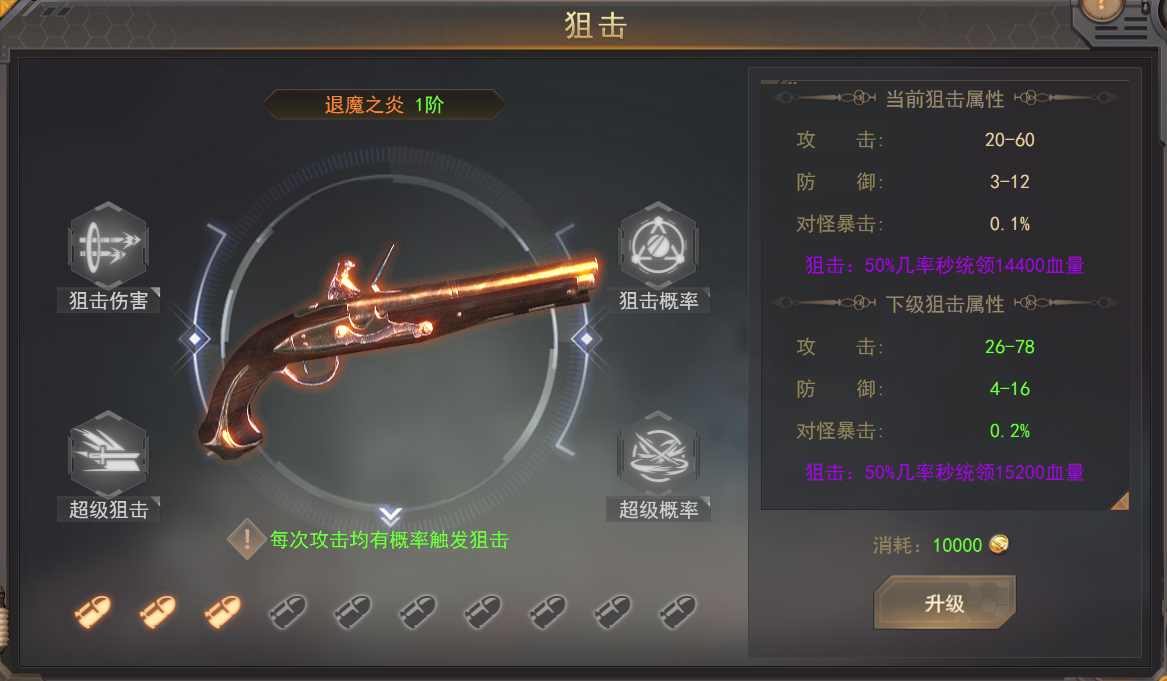 狙击是专门针对高血量BOSS的系统,激活狙击系统后每次攻击都有概率触发狙击伤害,狙击伤害触发时将可以直接秒杀BOSS大量的血量,狙击等级越高秒杀怪物的血量越多