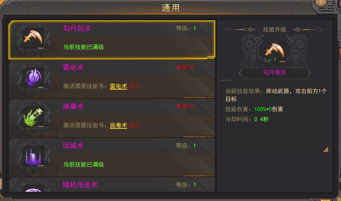 通过主界面系统按钮打开技能界面,在技能界面可以学习并升级强大的技能,技能分为通用技能和星技