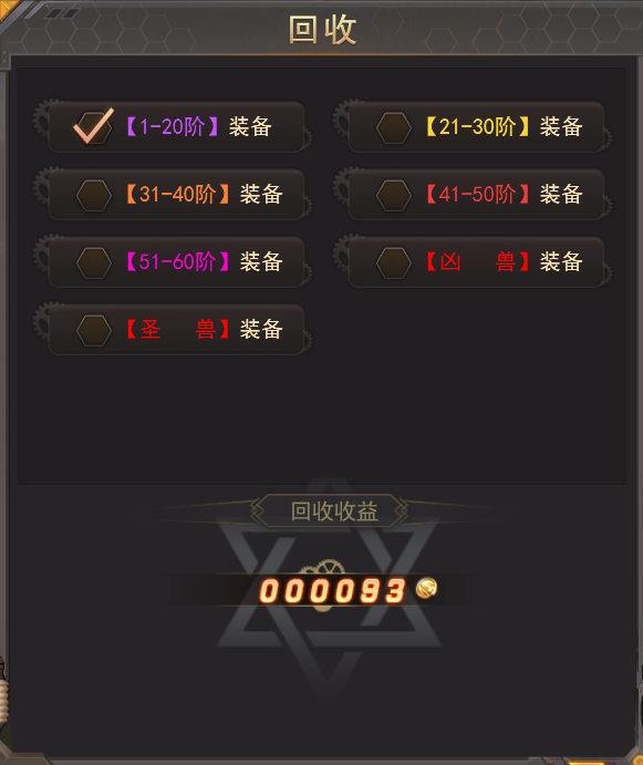 装备回收通过角色背包的装备回收按钮打开,可以回收玩家不需要的装备,装备回收可获得大量金币。装备回收的金币根据装备的等级决定。