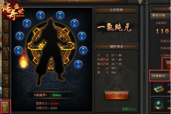 等级达到7转110级后就可开启心法,开启后需要在心法面板购买及等级兑换获得心法元力来提升等级,心法不仅能提升人物自身的攻击防御还能增加生命及魔法。
