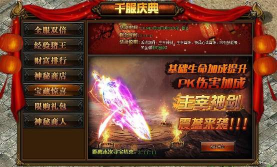等级上去了没有装备怎么能行呢?普通的装备是不是已经无法支持你制霸沙巴克的雄心了?只有最顶级的装备才能助你征伐天下!千服活动第二波,限购礼包随机放送顶级神翼礼包,极品道具声望包,还有宝藏惊喜,寻宝几率翻倍,主宰神剑、主宰首饰、极品高转首饰、终极技能等你来拿!