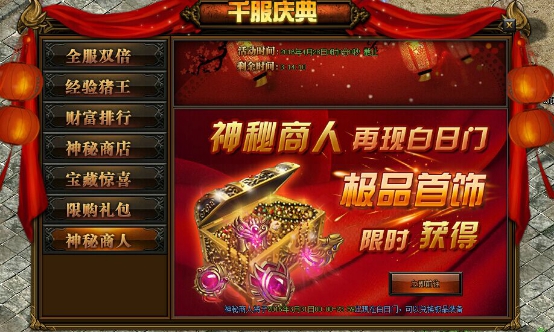 还有还有!全民优惠不止一波,神秘商人、神秘商店神出鬼没,随机刷出超低价的宝石、坐骑、声望、金砖、荣誉、魂珠等物品,可以使用元宝、金币、礼金进行购买,优惠这么大,贪多可不行哦~每样道具只能购买一次,机会有限!
