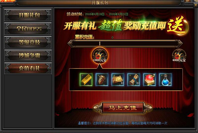 开服首充已经领了?每日首充奖励少了?开服活动增加充值有礼,达到一定的数目就有巨额奖励!低门槛,多档次,让你的钱更加值钱!充值性价比更高!