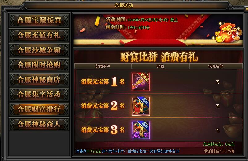 合服活动再加码,装备重铸让你的神兵再添威力,财富排行花的多奖得多,提升战力再也不用慌,让你知道谁才是合服后的老大!