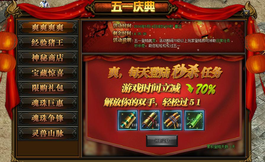 活动详情:活动期间,70级以上玩家每天登陆即可领取日常任务秒杀卷,游戏时间立减70%,助您轻松过五一哦~~