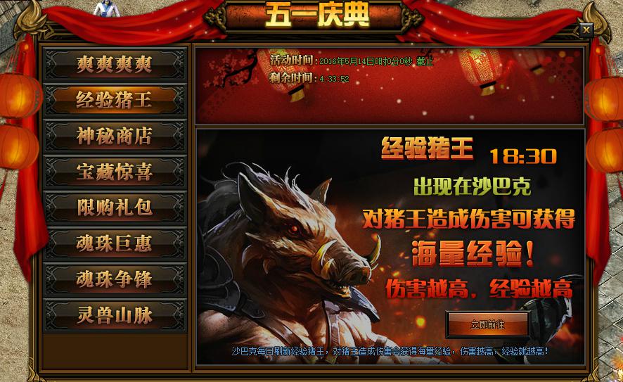 活动详情:活动期间每日18:30系统会准时在沙巴克刷猪王,玩家击杀猪王可获得经验,击杀伤害越高获得的经验越高