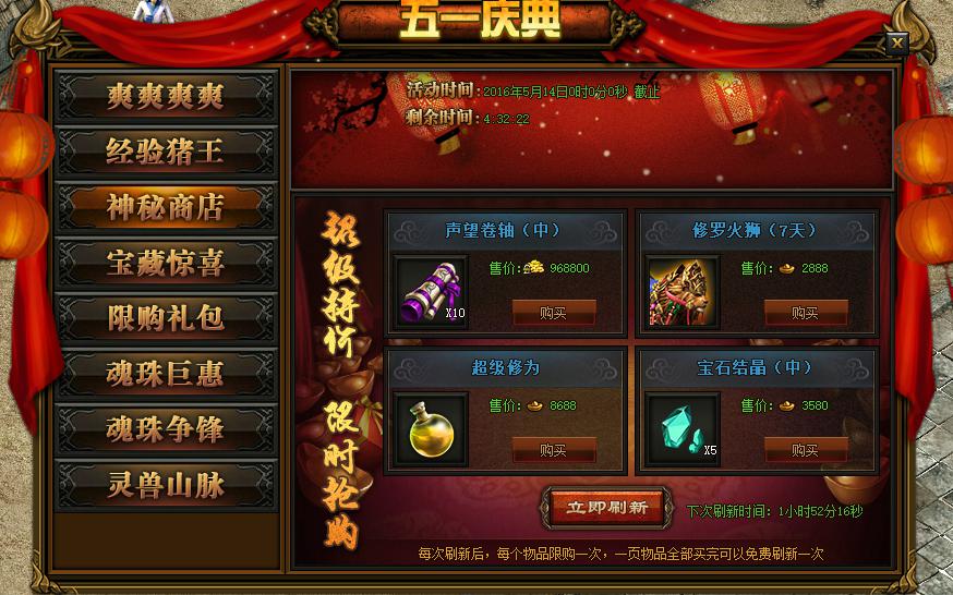 活动详情:动期间神秘商店内会推出极品道具并以超低的价格供玩家购买,宝石、坐骑、声望、金砖、荣誉、魂珠等你来抢,玩家可直接消耗元宝、金币、礼金进行购买,每样道具只能购买一次,当一页的物品购买完后,系统会自动免费刷新一次,您也可以消耗399元宝进行刷新。