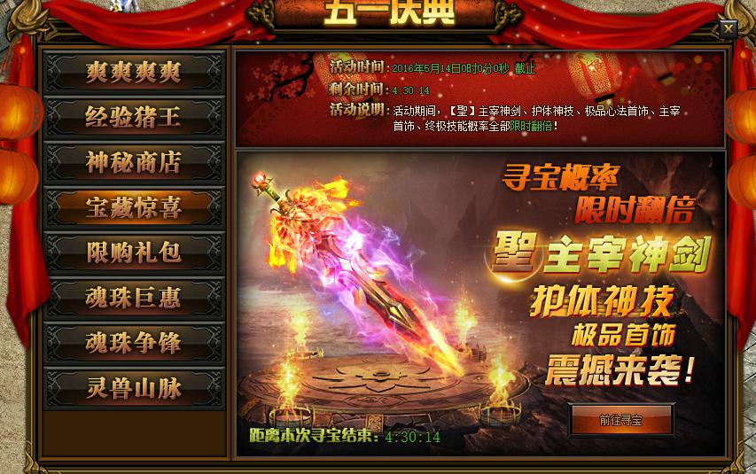 活动详情:活动期间,【聖】主宰神剑、护体神技、极品心法首饰、主宰首饰、终极技能概率限时翻倍,寻到的几率大大增加,小伙伴们千万不要错过哦~~