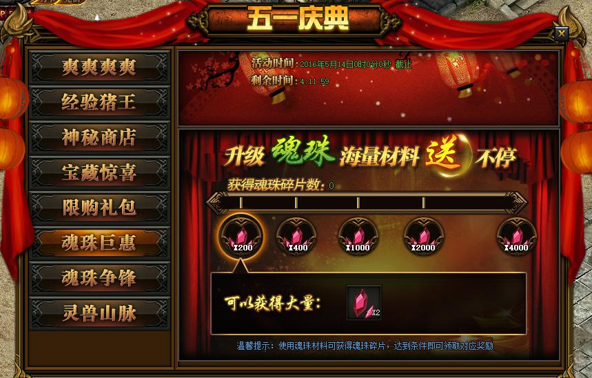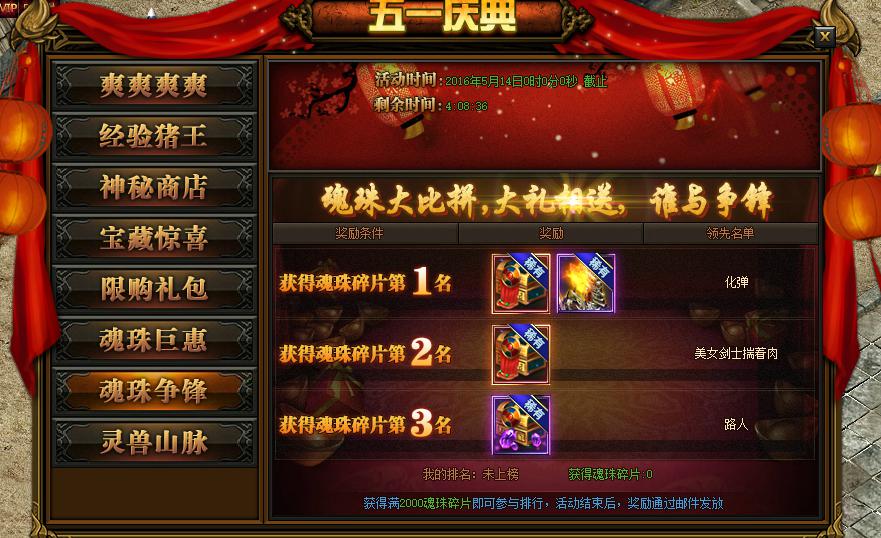 活动详情:活动期间玩家获得魂珠碎片满2000即可上榜,活动结束后奖励会已邮件的方式发放给玩家。