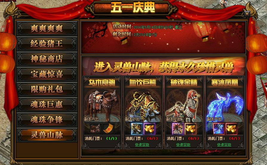活动详情:活动期间玩家可以进入灵兽山脉,玩家可以点击快速获取来购买门票,击杀灵兽可活动奖励哦~