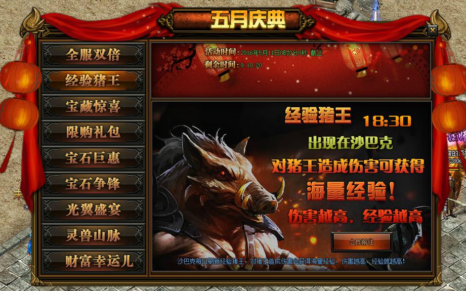 活动详情:活动期间每日18:30系统会准时在沙巴克刷猪王,玩家击杀猪王可获得经验,击杀伤害越高获得的经验越高