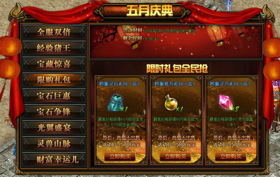 活动详情:活动期间系统会随机放出各种极品道具高级灵石、高级修为、高级灵力礼包等级根据VIP划分,比如V3以下为一档,V4-V6为一档,v7以上为一档,每档所展示的礼包都不一样,且均会以极低的价格供大家购买,每样道具每人只能购买一次。
