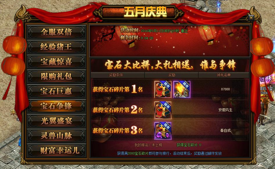 活动详情:活动期间玩家获得宝石碎片满2000即可上榜,活动结束后奖励会已邮件的方式发放给玩家。