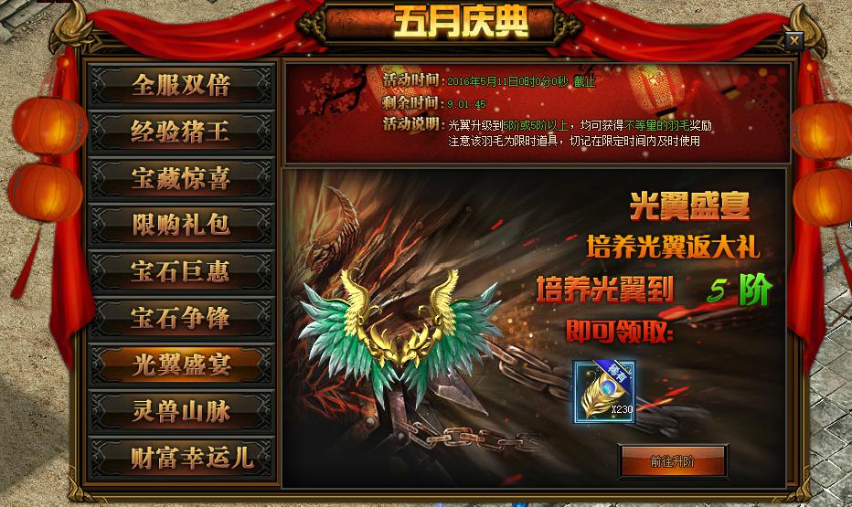 活动详情:活动期间光翼升级到5介或5介以上,均可获得不等量的羽毛奖励,注意该羽毛为限时道具,切记限定时间内及时使用。
