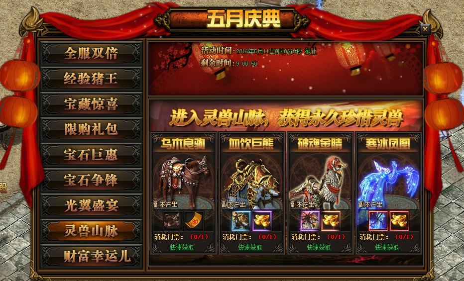 活动详情:活动期间玩家可以进入灵兽山脉,玩家可以点击快速获取来购买门票,击杀灵兽可活动奖励哦~活动boss随机掉落活动奖励,活动界面所显示的奖励为该boss最高掉落奖励,低档次奖励也是会随机掉落。