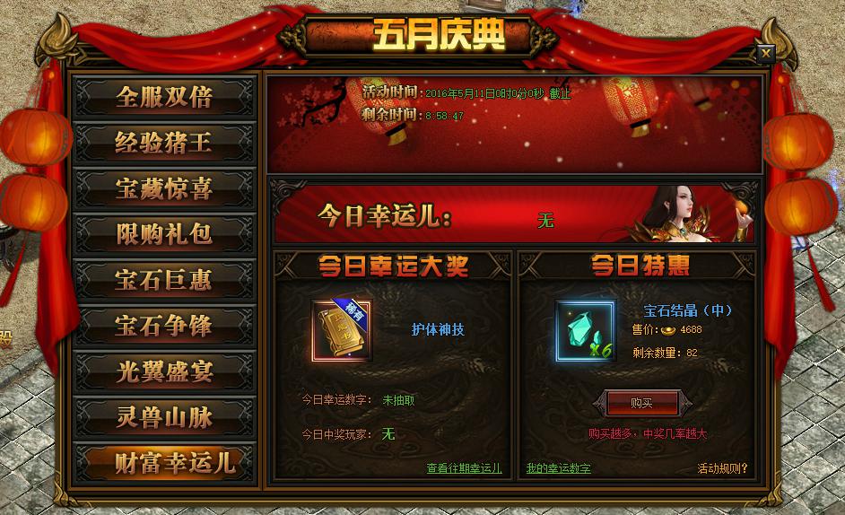 活动详情:活动期间每天0-21点可以购买特惠礼包,每服限量100个,购买特惠礼包可以获得1-100的幸运数字,数字不会重复,每天的21:00系统会随机抽取一个幸运数字,中奖的玩家将会获得该日的幸运大奖,奖品会通过邮件的方式发放给玩家。