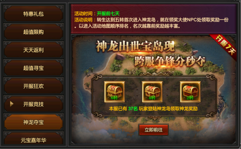 活动说明:转生达到五转首次进入神龙岛,就在领奖大师NPC处领取奖励一份。以进入活动地图顺序排名,名次越靠前奖励越丰富。