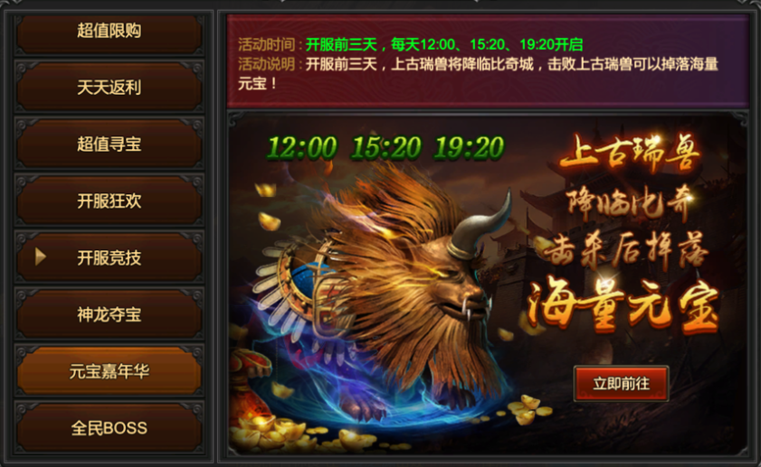 活动说明:开服前三天,上古瑞兽将降临比奇城,击败上古瑞兽可以掉落海量元宝!