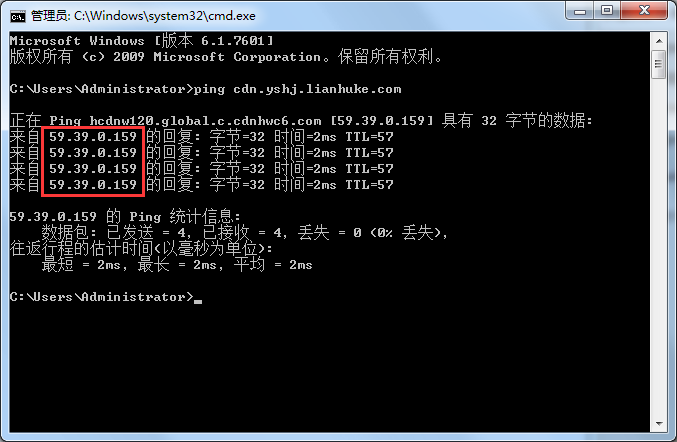 输入:<strong>ping cdn.yshj.lianhuke.com</strong> 回车,获取对应请求数据如下:可得到IP为:<strong>59.30.0.159</strong><br />