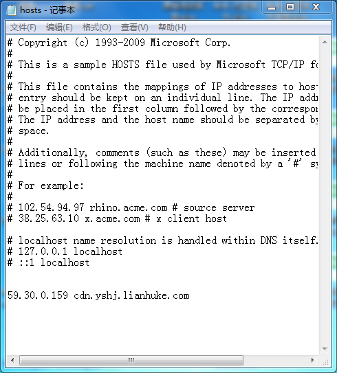 进入<strong>C:\Windows\System32\drivers\etc</strong> 目录,找到hosts文件,文本方式打开,在文件尾部加入以下内容:<br />